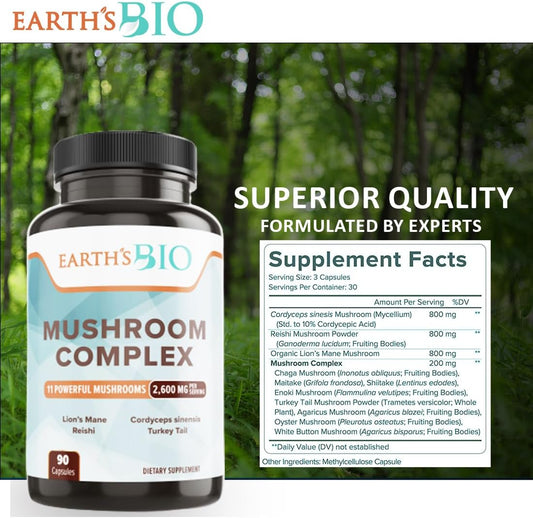 Organic Mushroom Supplement Complex 2,600 mg, 90 Capsules - Lion's Mane, Turkey Tail, Enoki Agaricus, White Button & Oyster Mushroom Blend for Memory & Immune Support