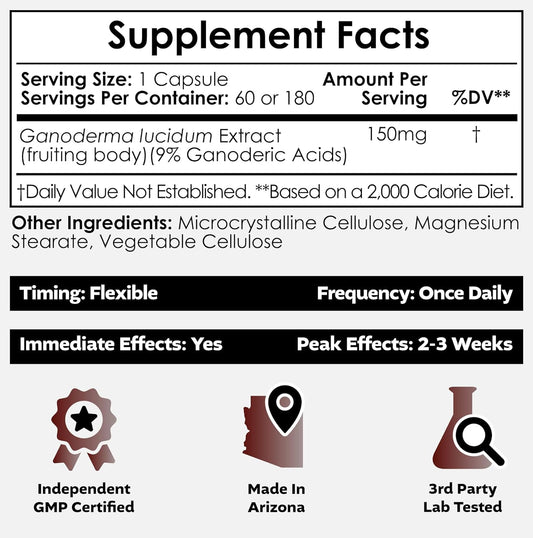 Red Reishi Mushroom Capsules with 9% Ganoderic Acids - 150mg (180 Count) by Nootropics Depot
