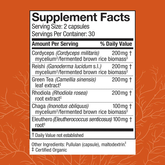 MycoBotanicals Energy Capsules - Herbal Green Tea Supplement for Energy & Respiratory Support - With Cordyceps, Reishi & Chaga - 60 Capsules