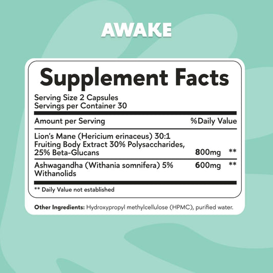 Lions Mane & Ashwagandha Mushroom Supplement Capsules for Brain, Memory & Stress Relief - Fruiting Body & Root Blend for Focus, Energy & Wellness - 60 Capsules