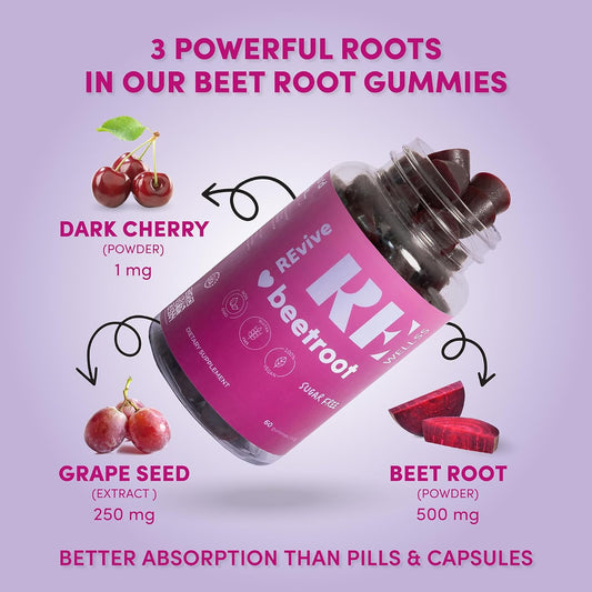Cherry Flavored Beet Root Gummies with Grape Seed Extract for Energy & Blood Pressure Support - 60 Gummies, Sugar-Free Nitric Oxide Supplements for Men & Women