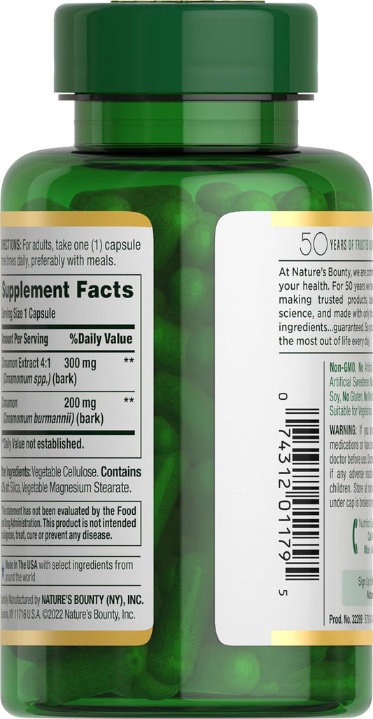 Cinnamon Capsules 1500mg Herbal Supplement for Sugar Metabolism Support - 100 Capsules by Nature's Bounty