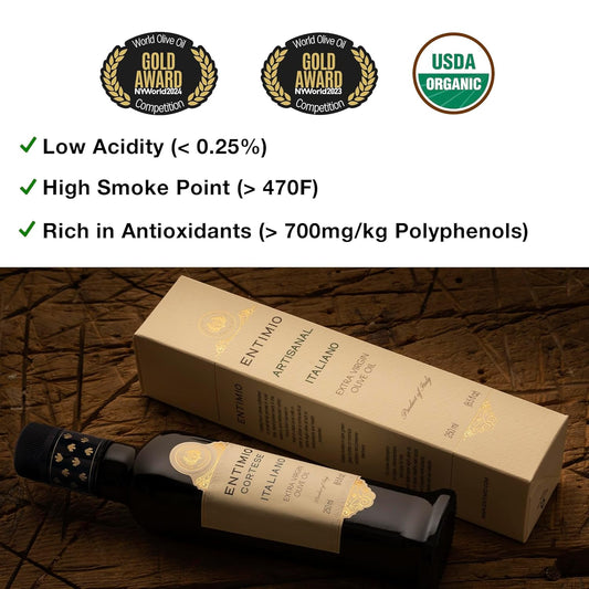 Entimio Cortese Organic Extra Virgin Olive Oil: 2024-2025 Early Harvest Tuscan Oil, 700 mg/kg Polyphenols, Gold Winner - 8.5 fl oz