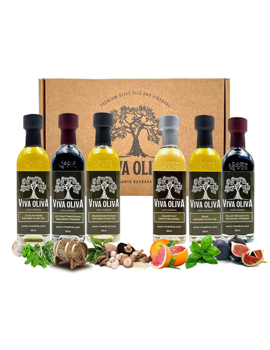 Premium Flavored Olive Oil & Balsamic Vinegar Variety Gift Set - 60ml (2oz) Bottles - Tuscan Herb, Basil, Mushroom & Sage - 18 Year Traditional, Grapefruit, Black Mission Fig