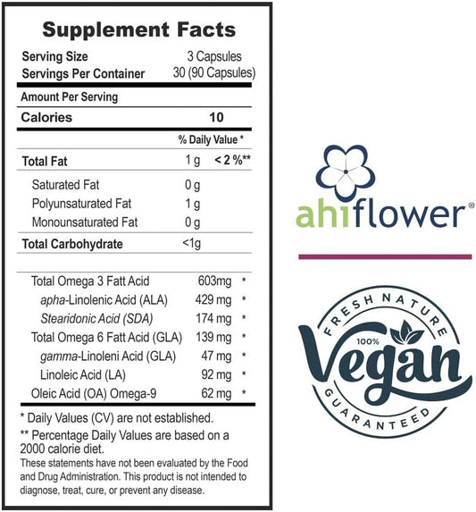 Vegan Ahiflower Oil Capsules by Vidalia - 90 Count, Omega 3, 6 & 9 Supplement from Sustainable Source - Vegan Friendly - NO Fish