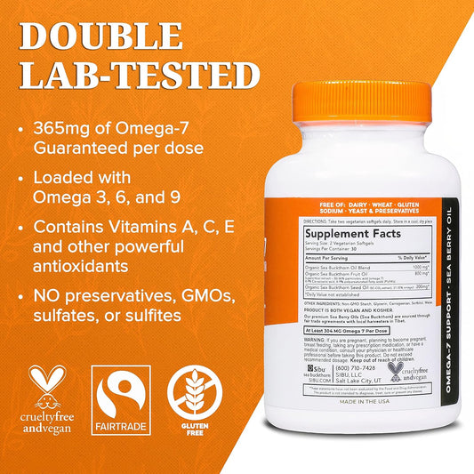 Organic Himalayan Sea Buckthorn Oil Softgels for Healthy Skin, Hair, Nails - Sibu Omega-7 Supplement (60ct)