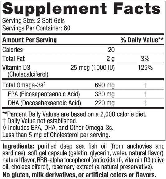 Nordic Naturals Omega-3D Lemon Flavor Soft Gels - 690mg Omega-3 + 1000 IU Vitamin D3 - Fish Oil Supplement for Immune, Brain, Heart & Bone Health - Non-GMO - 60 Servings