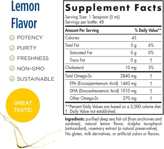 High Potency Nordic Naturals ProOmega Liquid Lemon Fish Oil - 8 oz Bottle, 2840 mg Omega-3 with EPA & DHA for Brain, Eye, Heart, & Immune Health - Non-GMO, 48 Servings