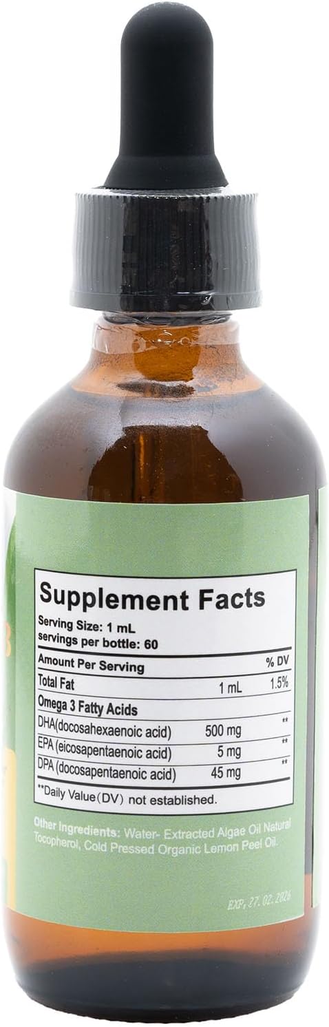 Organic Lemon Flavored Vegan Omega-3 Drops - Plant-Based Algae Oil with EPA, DHA & DPA for Heart, Brain & Joint Health - Non-GMO Liquid Vitamin - 60 Doses