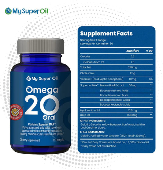Omega 20 Green Lipped Mussel Oil Softgels, 30 Count, Burpless Fish Oil Supplement, 300% More Effective for Cardiovascular & Joint Health