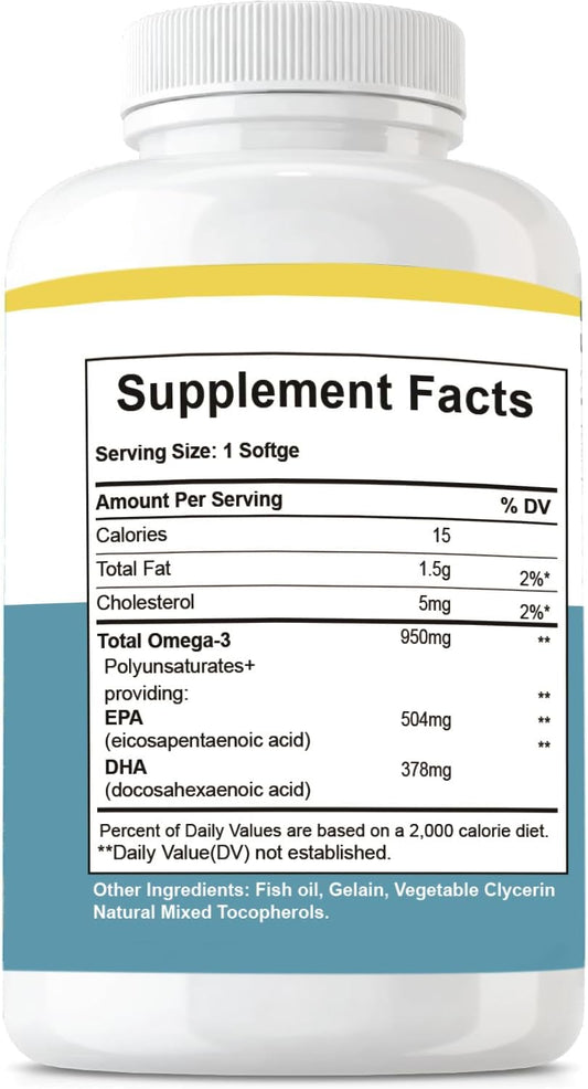Omega 3 Fish Oil Softgels 1000mg, EPA and DHA Supplement for Heart, Brain, Joints, Eyes - 100 Count