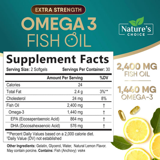 Triple Strength Omega-3 Fish Oil Supplement for Brain and Heart Health - 2400mg EPA & DHA Fatty Acids - Nature's Choice - 60 Softgels