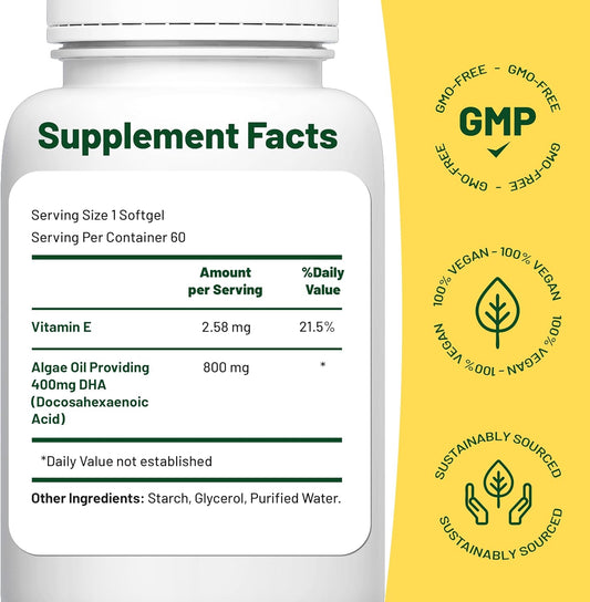 Vegan Algae Omega 3 Supplement with DHA for Heart & Brain Health - 1000mg Per Serving - No Fishy Aftertaste - 60 Softgels