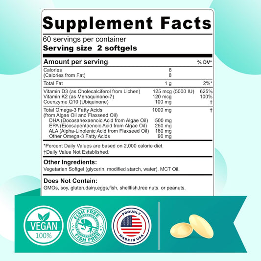 Plant-Based Vegan Omega 3 DHA EPA ALA Supplement with Vitamin D3 K2, CoQ10 for Immune Support - 120 Softgels