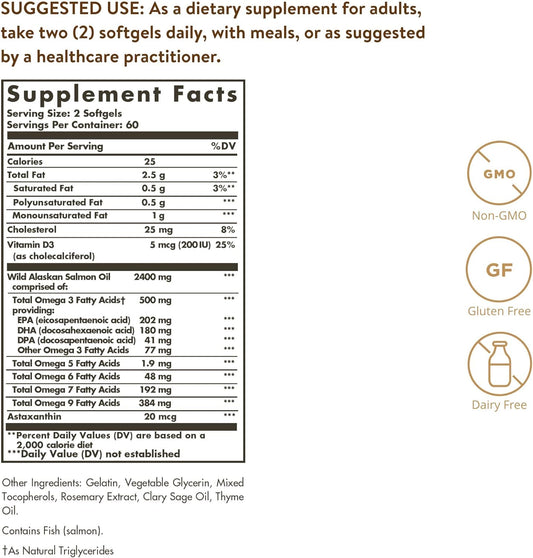 Solgar Wild Alaskan Omega Softgels with Vitamin D3 - Heart, Brain, Bone & Skin Health - 120 Count - Non GMO & Gluten-Free