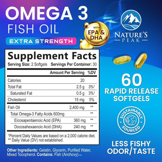 Premium Nature's Peak Omega-3 Fish Oil Softgels - 2400mg Triple Strength Supplements for Brain & Heart Support - Sustainably Sourced EPA & DHA Omega-3 Formula - 60 Count