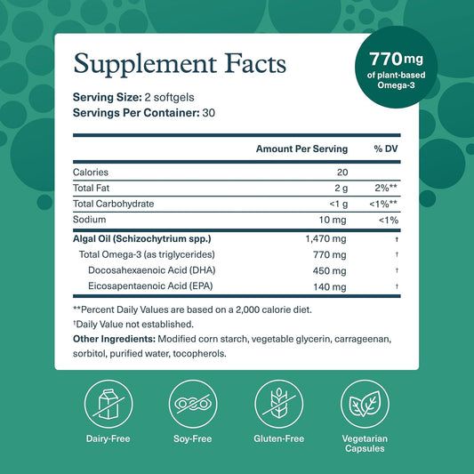 Vegan Algae Omega 3 Softgel with EPA & DHA for Heart, Eye & Brain Health - Ocean-Friendly Formula in Recyclable Container - Gluten, Soy & Dairy Free - 60 Softgels