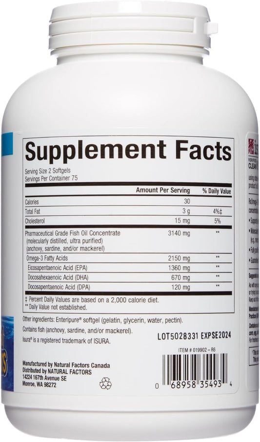 Natural Factors Ultra Strength RxOmega-3 Fish Oil Softgels - High Potency Formula with 2,150mg Omega-3 Per Serving, No Fishy Aftertaste - 150 Count
