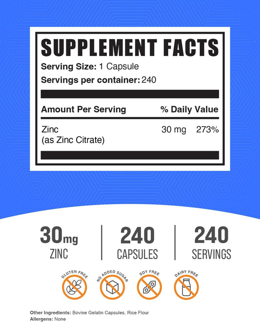 BulkSupplements.com Zinc Citrate Capsules - 30mg Immune Support Supplement - Gluten Free - 240 Capsules