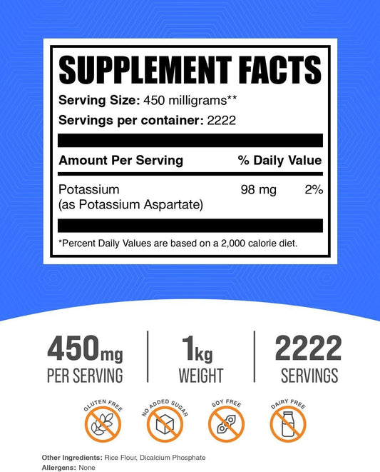 BulkSupplements.com Potassium Aspartate Powder - Gluten Free Supplement with 450mg Potassium per Serving - 1kg (2.2 lbs) Pack