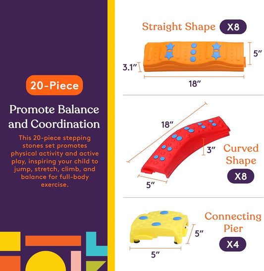 20 Piece Kids Stepping Stones Set for Indoor and Outdoor Balance Activities - Promotes Coordination, Strength, and Balance with Child Safe Rubber Bottoms
