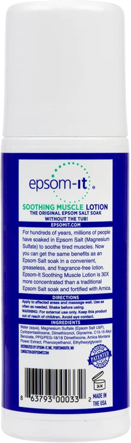 3oz Epsom Salt Lotion Roll On with Arnica for Muscle Aches, Stiffness, Leg Cramps, Knees, Achy Feet - Topical Magnesium Cream for Soothing Relief