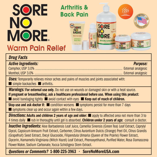 8 oz Sore No More Warm Relieving Gel for Arthritis & Backaches - Fast Absorbing with Orange Scent