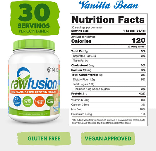 SAN Rawfusion Vegan Protein Powder, Vanilla Bean - 30 Servings, 21g Plant-Based Protein, Low Net Carbs, Non-Dairy, Gluten-Free, Soy-Free, Kosher, Non-GMO, 2.06lbs - Top Quality Vegan Protein Powder With Vanilla Flavor