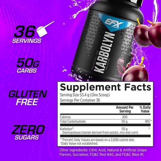 EFX Sports Karbolyn Fuel Carbohydrate Powder - Grape Flavor | Rapid Absorption for Carb Loading, Energy, Recovery | Stimulant-Free Formula | 36 Servings