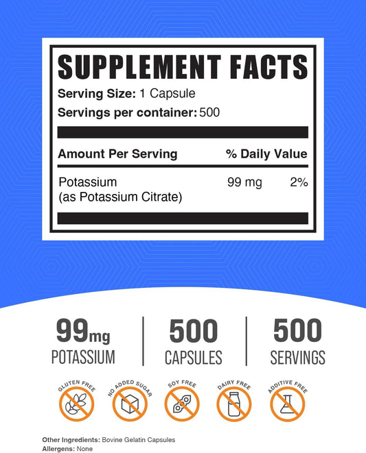 High Potency Potassium Citrate Capsules - 99mg Potassium Citrate Supplement - 500 Capsules, 1 Capsule per Serving - BulkSupplements.com