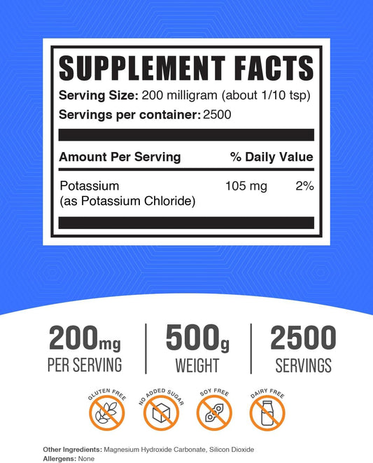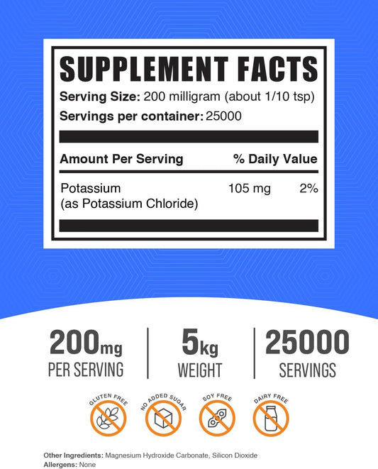 BulkSupplements.com Potassium Chloride Powder - Potassium Supplement Salt Substitute, Gluten Free, 200mg per Serving, 1kg (2.2 lbs)