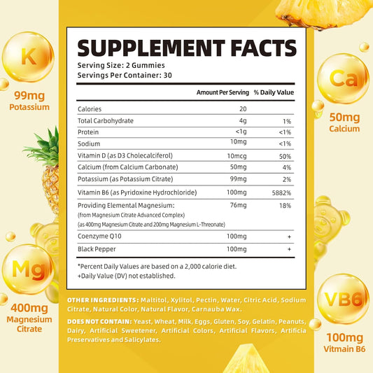 Vegan Sugar-Free Potassium Gummies with Magnesium, Vitamin B6, CoQ10 for Leg Cramps & Muscle Health - Pineapple Flavor - 60 Gummies