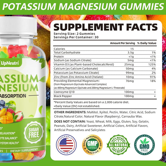 Sugar-Free Potassium Magnesium Gummies for Adults & Kids - Supports Muscle Health & Immunity - High Absorption Vegan Supplement - 5 Fruit Flavors - 60 Count