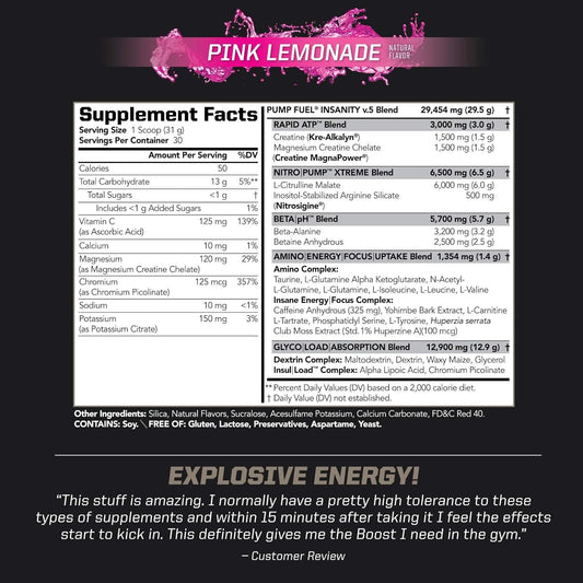 PMD Sports Ultra Pump Fuel Insanity Pre Workout Drink Mix - Energy, Strength, Endurance, Recovery - Complex Carbs, Amino Energy - Electric Pink Lemonade