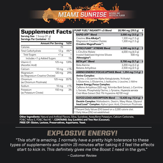 PMD Sports Ultra Pump Fuel Insanity - Pre Workout Drink Mix - Energy, Strength, Endurance, Recovery - Complex Carbs, Amino Energy - Miami Sunrise (30 Servings)