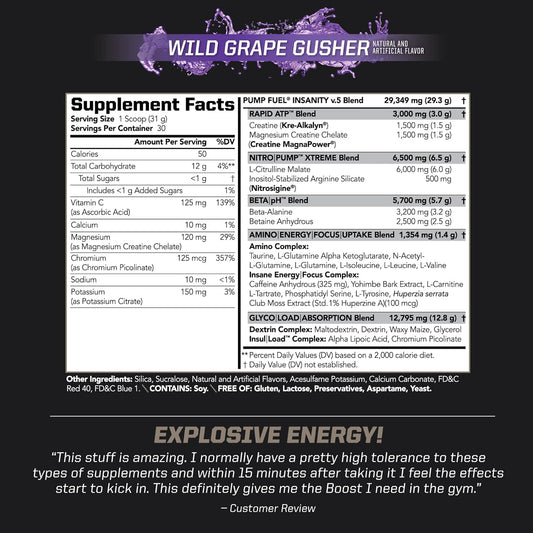 PMD Sports Ultra Pump Fuel Insanity - Pre Workout Drink - Wild Grape Gusher Flavor - Boost Energy, Strength, Endurance, Recovery - Complex Carbs, Amino Energy - 30 Servings