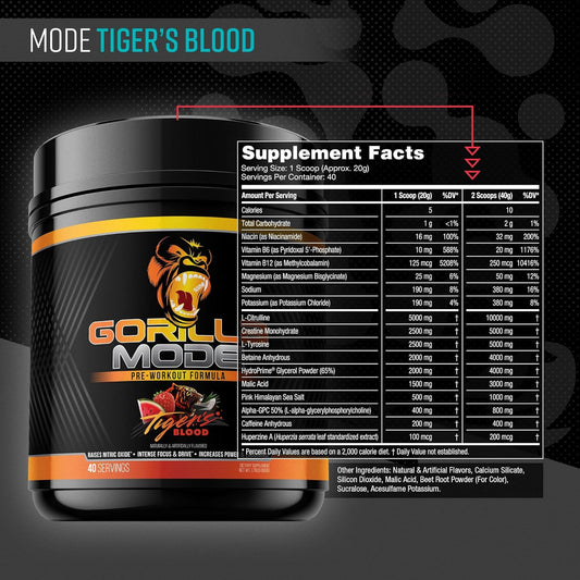 Gorilla Mind Gorilla Mode Pre Workout - Boost Energy, Focus, and Strength - L-Citrulline, Creatine, L-Tyrosine, Betaine - 800g (Tigers Blood)