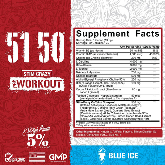 High Stim Pre-Workout Powder for Extreme Energy, Focus, and Endurance - 5% Nutrition Rich Piana 5150 with 400mg Caffeine, Citrulline, Beta Alanine, and N-Acetyl L-Tyrosine - Blue Ice Flavor, 30 Servings