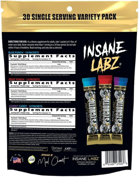 Insane Labz Psychotic Gold Pre Workout Powder - High Stimulant Energy Focus, Pumps, Endurance - Beta Alanine, DMAE Bitartrate, NO Booster - 30 Servings, Variety