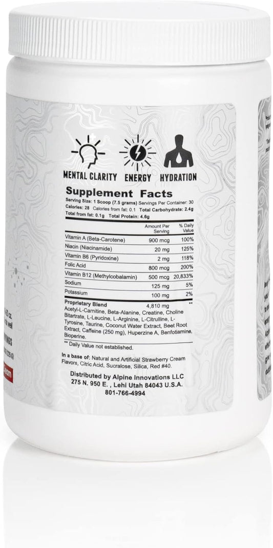 Alpine Innovations Body Fuel Focus + Energy Supplement - Strawberry Cream Flavor, 30 Scoop Tub for Enhanced Focus and Energy Without Jitters.