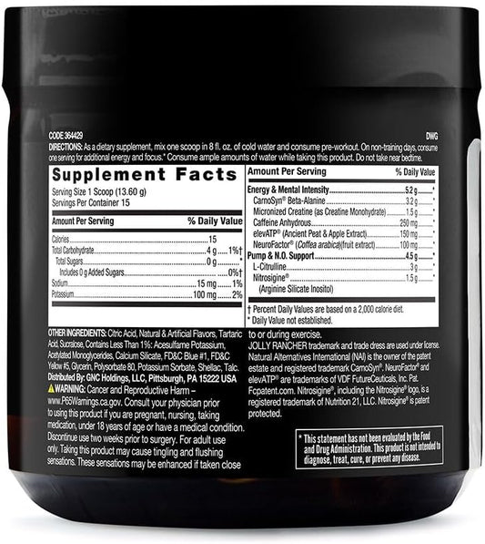 Clinically Dosed Pre-Workout Powder with Caffeine, L-Citrulline, Beta-Alanine, and Nitric Oxide - Jolly Rancher Green Apple Flavor - 15 Servings