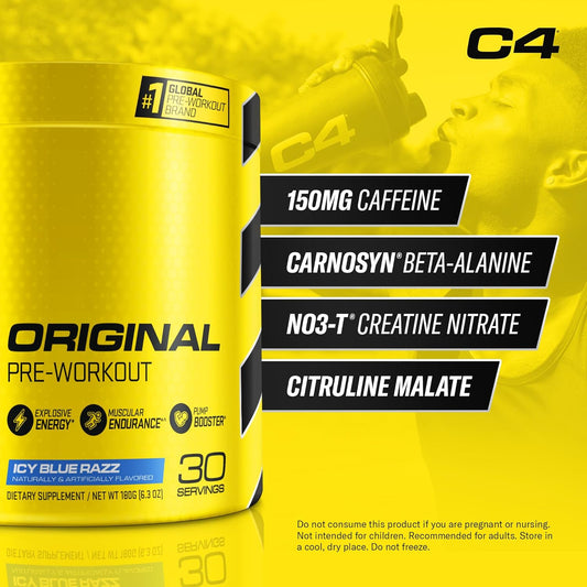Cellucor C4 Original Icy Blue Razz Pre Workout Powder - Sugar Free Energy Boost for Men & Women - Immune Support with Vitamin C - 30 Servings