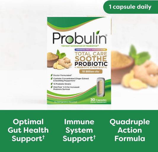 Probulin Total Care Soothe Capsules with Prebiotic, Probiotic, Postbiotic, Ginger & Mint - 15 Billion CFU, 30 Vegan Capsules