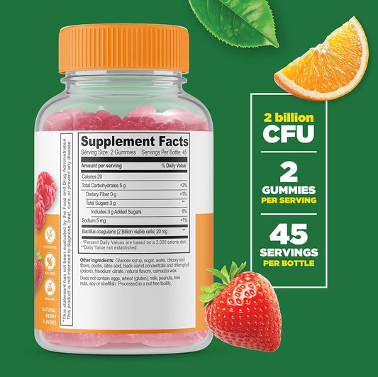 Kids Probiotic Gummies with Prebiotics Fiber - 2 Billion CFUs - Digestive & Gut Health Support - Vegan Berry Flavored Chewables