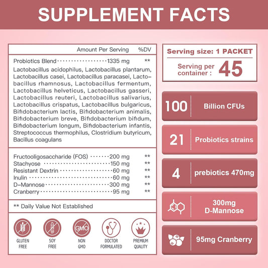 Women's Probiotic Powder with Prebiotics, 100 Billion CFUs, 45-Day Supply - Supports Urinary Tract, Gut, Digestive Health - Includes D-Mannose and Cranberry