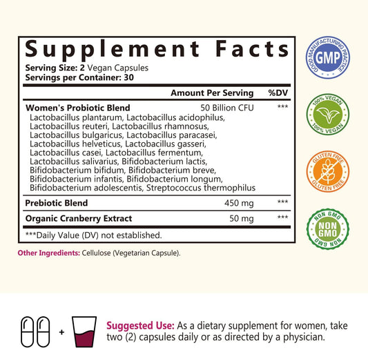 Women's Probiotic Supplement with 50 Billion CFU, 18 Strains, Prebiotic, Cranberry - Digestive, Vaginal, Urinary Health Support - 60 Vegan Capsules, Shelf Stable