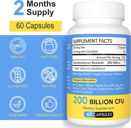 High Potency Saccharomyces Boulardii Probiotics 200 Billion CFUs, Clinically-Proven for Gut & Immune Health, Acid Resistant & Shelf-Stable, 60 Day Supply for Men & Women