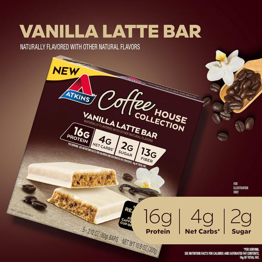 Atkins Coffee House Vanilla Latte Meal Bars - 16g Protein, 4g Net Carbs, 2g Sugar, 13g Fiber - Made with Real Coffee - 30 Bars Total