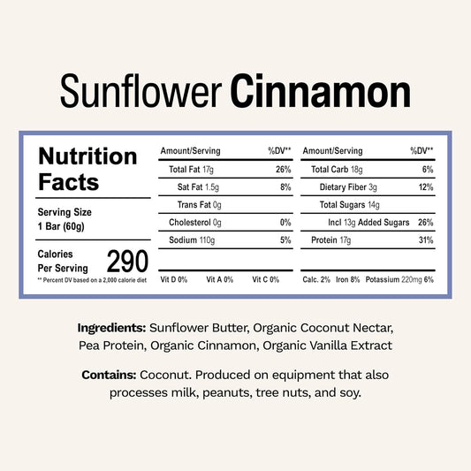 Vegan Sunflower Cinnamon Protein Bar | Rise Pea Protein Breakfast Snack | 17g Protein | Non-GMO, Gluten-Free, Soy-Free | 5 Whole Food Ingredients