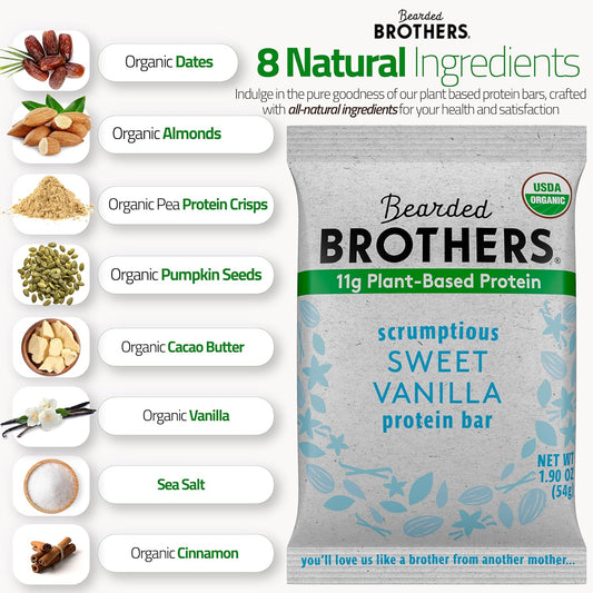Organic Vanilla Protein Bars (10 Pack) - Bearded Brothers, 11g Plant-Based Protein, Gluten-Free, Vegan, Non-GMO, High Fiber Healthy Snacks for Adults